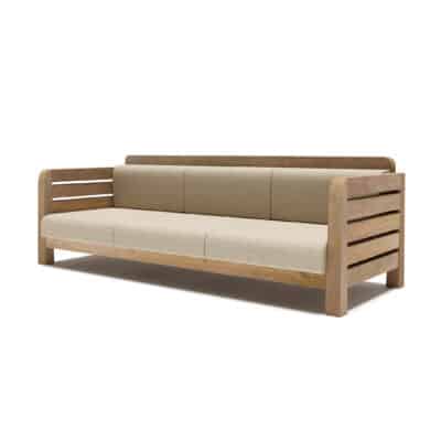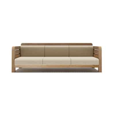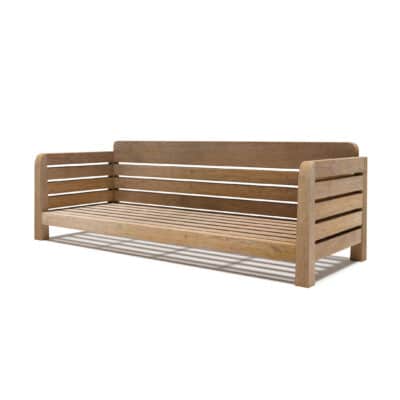The Tach stands out for its strong presence and timelessly simple design. Crafted from recycled teak, it highlights the wood’s warm tones and expressive grain, creating a grounded, distinctive character. The lounge’s low, generous proportions offer an effortlessly inviting silhouette.